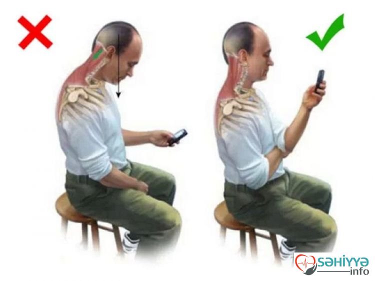 Telefona baxarkən daim başın və boyunun aşağı bucaq altında əyilməsi ağırlıq boynun fəqərələri üzərinə düşür. Boyun gün ərzində bu vəziyyətdə duruş üçün nəzərdə tutulmayıb.