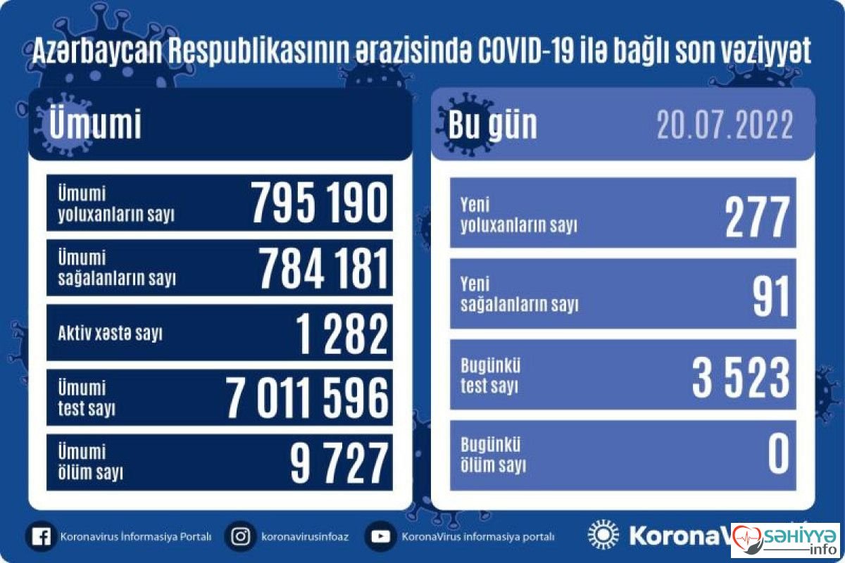 Azərbaycan Respublikasında koronavirus (COVID-19) infeksiyasına 277 yeni yoluxma faktı qeydə alınıb, 91 nəfər müalicə olunaraq sağalıb.